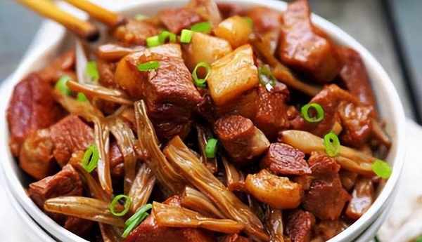 原料:猪肉450克,干豆80克,冰糖5粒,香叶3片,八角1片,小桂皮1片,料酒3茶匙,生抽3茶匙,生抽3茶匙,葱姜适量,盐适量