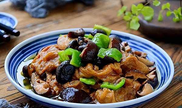 原料:干香菇40克,发面筋20个,青椒半个,甜面酱1汤匙。