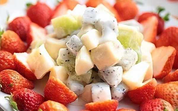 7.将混合好的水果放在盘子里,放在周围草莓的中央。与草莓上的酸奶一起食用。