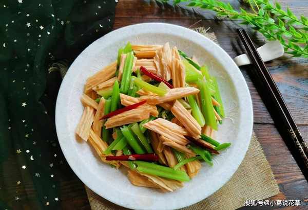 加入腐竹和芹菜,炒至光滑,撒上盐和味精出锅。