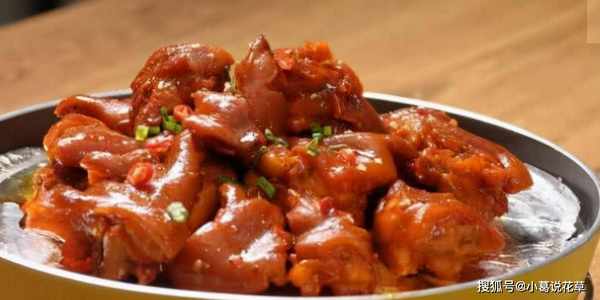 2、油锅置火上,下红辣椒、花椒炒香,再放入猪蹄略炒,加盐、酱油、红油、料酒调味。