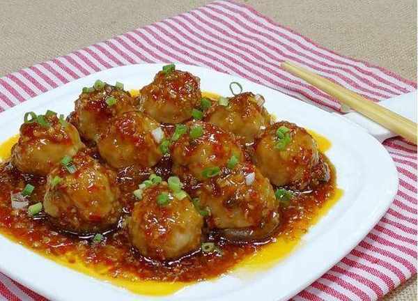 4、热锅倒入油,倒入姜末用小火翻炒几下,加入蒜末用文火炒香,加入泡椒末翻炒至油红香。倒入糖醋汁拌匀,倒入蒸香菇的水,最后加入水淀粉勾芡,淋在丸子上,撒上葱花。