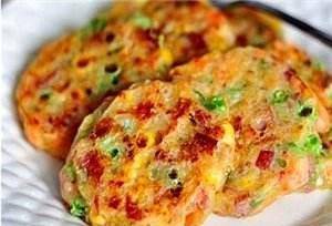 材料:玉米面100克,面粉30克,水适量,玉米粒50克,四季豆50克,胡萝卜籽50克,红葱头25克,培根50克,盐,糖,胡椒粉