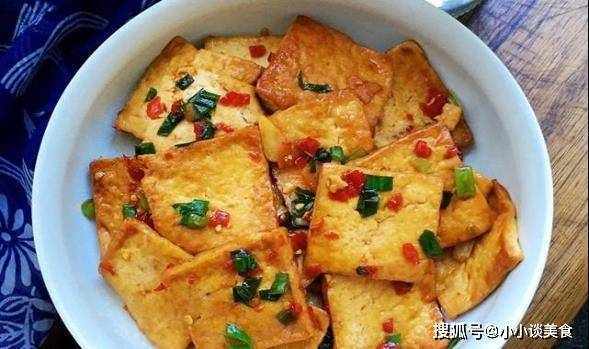 4、锅里放油烧热,放入豆腐块,用小火慢慢煎。