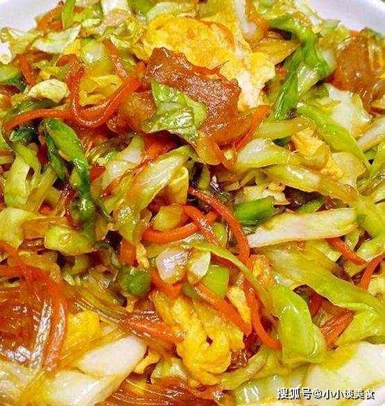 3、打两个鸡蛋在碗里;锅里放油,烧热至80%,倒入蛋液,用筷子摊开,盛出待用;炒好鸡蛋的锅里倒入适量的油,加入肉丝炒至颜色变白;然后加入胡萝卜和卷心菜,搅拌至卷心菜变软;倒入切好的粉丝,快炒,用筷子炸好;