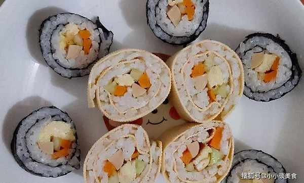 材料豆腐皮1张、米饭1杯、鸡蛋1个、黄瓜半根、胡萝卜半根、火腿肠1根、盐少许、香油少许、醋一瓶