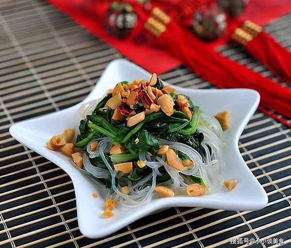 3、粉丝用剪刀剪短,和菠菜部分一起放在一个大碗里,加盐、醋、糖和鸡高汤拌匀,倒入香油拌匀。将拌好的粉丝和菠菜装盘,撒上黄飞鸿花生米。边吃边拌匀