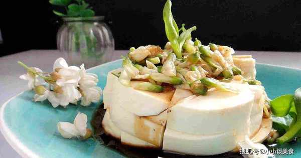 3.豆腐切块,将槐花、姜末和味噌酱拌匀淋在豆腐上。