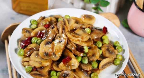实践:1.准备材料。香菇泡水洗净;豌豆沥干水洗净,蘑菇去核,切成约3毫米厚的片。