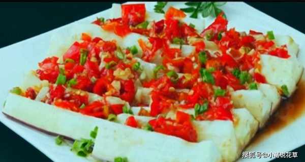 3.将切碎的辣椒撒在茄子上。