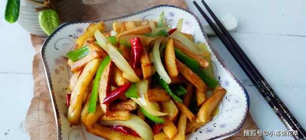 6、加入姜片、蒜片、干辣椒爆香,加入洋葱、辣椒炒至颜色变深断7.加入薯条、生抽、盐,快速搅拌均匀,关火,捞出装盘