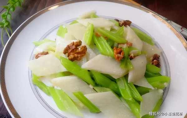 原料:芹菜250克,山药250克,煮熟的核桃仁100克,油、盐适量,大蒜2瓣,鸡精1/2茶匙,水淀粉适量,