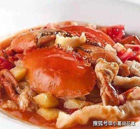 2、锅中放入少量红花油,烧热。先加入番茄酱和番茄块炒香。倒入蟹块炒匀,拌入鲜汤加盐、糖、味精。煮3分钟,然后取出面筋。将其放入锅中,看到汁液收干后,再装到盘子里。
