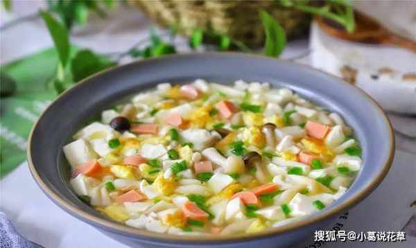 【原料】:肥豆腐一盒,鸡蛋一个,虾香菇一把,火腿肠一根,盐适量,油少许,料酒少许。