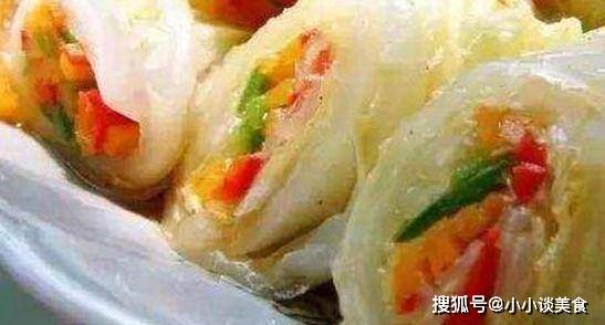 4、将切块均匀的叠在卷心菜卷上,做成四个相等的扇形;