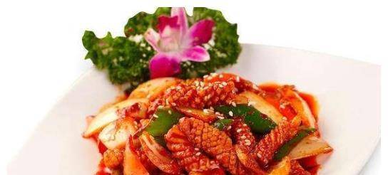 2、锅内放色拉油烧热,下入炸好的猪肉、姜、蒜炒香,再放入海肠,炒熟后加入酱汁和栗子水、芝麻倒油起锅。把它放在盘子里,用切碎的葱和红辣椒装饰,然后和自制的芝麻煎饼一起食用。