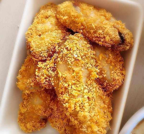 4、将腌制好的鸡翅裹上面包糠,烤箱180度加热。烘烤约25分钟。