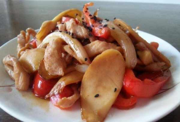 5.出锅前加入炸好的肉片一起炒,少许盐。