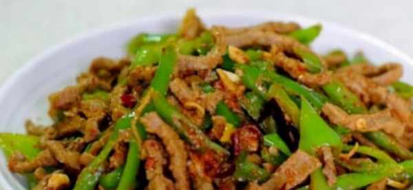 4.这时候锅里还剩下一些油,放剩下的葱姜爆香,下青椒炒至青椒变色,加少许盐,下肉,炒一会而更长的时间,加入孜然粉,一边搅拌一边炒辣椒面。