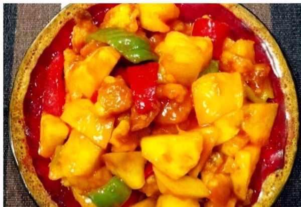 10、不加油的情况下,将调好的酱汁倒入锅中烧开。然后倒入淀粉水,搅拌至浓稠。11.将炸好的鱼片放入锅中,让酱汁均匀覆盖。加入切成薄片的青红椒和菠萝,然后将所有东西一起炒。最后,在上菜之前,在锅边倒一些醋。