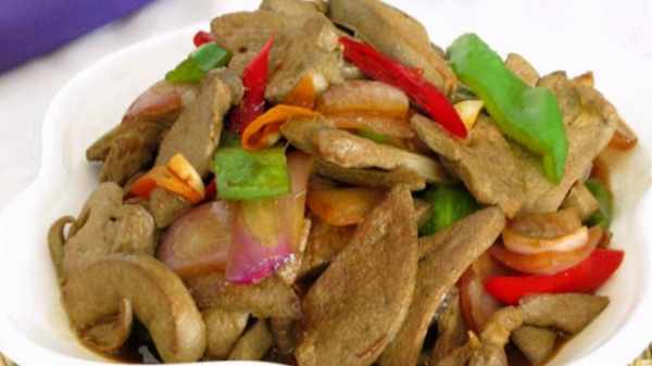 5、热锅烧热油,放入腌制好的猪肝片,用旺火边炒边炒,至猪肝表面变色即成。
