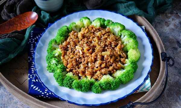 原料:西兰花200克,猪肉馅60克,海米少许;生抽1汤匙、蚝油1/2汤匙、老抽1汤匙、料酒1汤匙、糖1/2茶匙、蒜头2瓣、植物油适量、白胡椒粉少许、淀粉少许、2/3茶匙盐