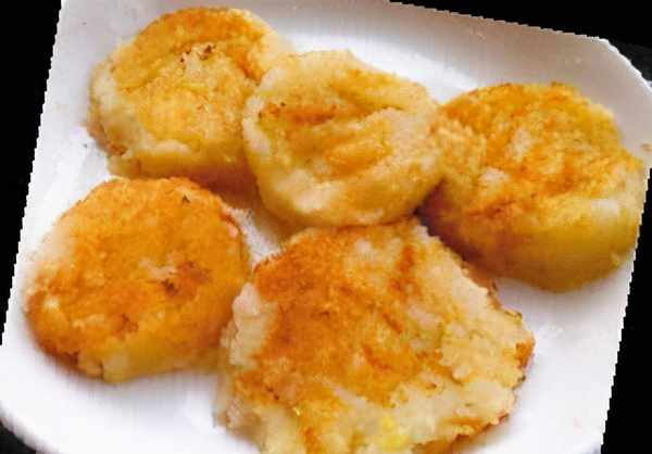 15、热锅烧热油,开小火,让土豆饼平躺开始煎。煎的时候要一直小火,这样表面不焦,里面还没有熟。
