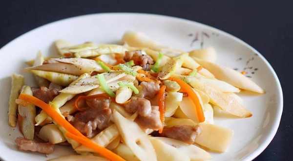 做法:1、将笋切段;大蒜捣碎,肉切块,肥肉放一旁待用,瘦肉用糖、盐、油、老抽、淀粉腌半小时。2、锅烧热不放油,锅中放入笋片,加少许盐,边搅拌边炒一分钟,锅中倒入油,加热至40%,放入腌制好的肉片,炒至肉变色白色,放入碗中,加入肥肉炒至微出油,加入蒜炒香,将我们之前炒过的瘦肉和笋片倒入锅中,加入生抽拌匀!