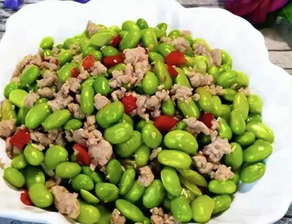 锅内加油,小葱、姜片爆香,加入肉末炒至变色,倒入毛豆,稍微翻炒一下,加盐翻炒均匀,加少许水和文火煮3分钟;