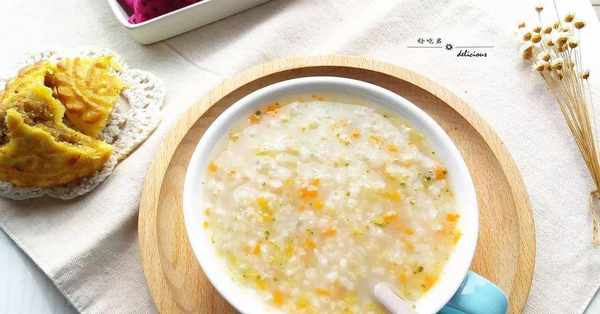 西兰花20克、红萝卜30克、糙米45克、大米50克、盐2克、香油2克