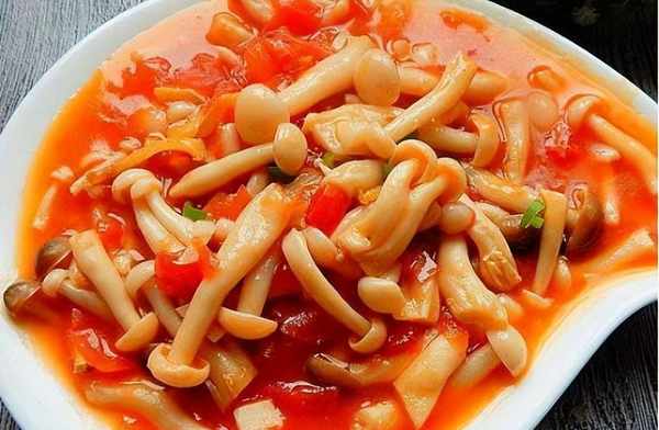 4、锅中油烧热,放入白玉菇翻炒,加少量酱油调味,再放入小番茄翻炒。