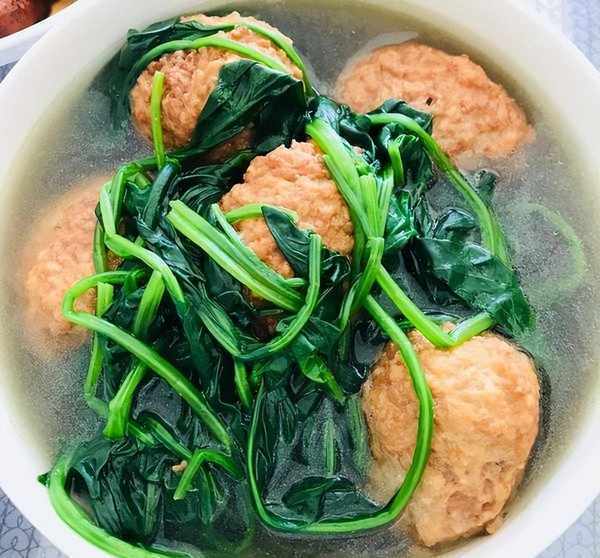 6.炒好的菠菜颜色变了,丸子进汤里了。