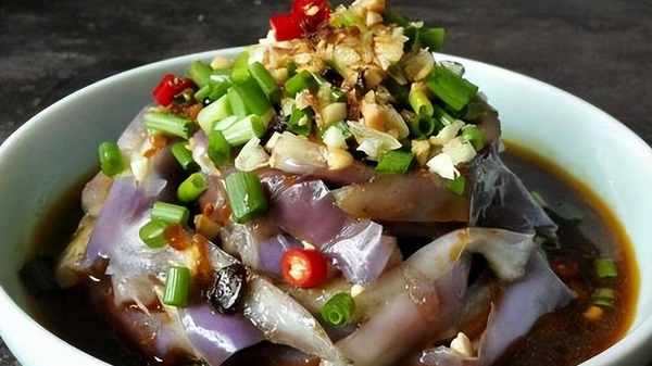 材料:紫茄子2个,葱姜蒜少许,生抽1茶匙,老抽少许,醋少许,味精少许,盐,油辣椒,花椒或藤椒油、糖半匙;