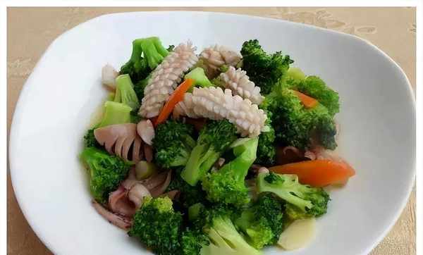 材料:鱿鱼200克、西兰花200克、郫县西洋菜、盐、料酒、姜、蒜