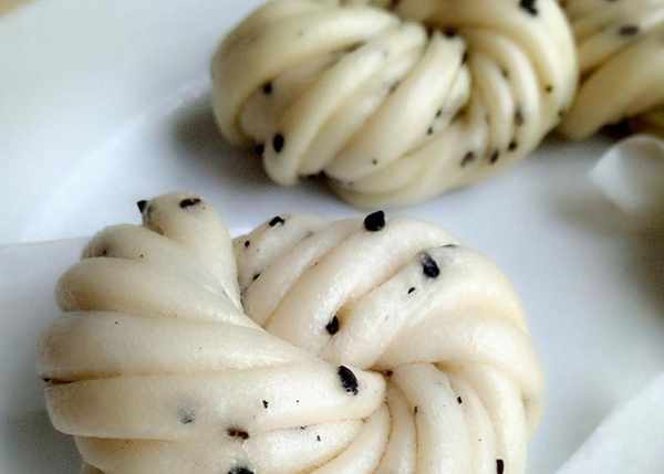 做法1、面粉倒入水+糖+酵母,揉成絮状,撒上黑芝麻,揉成软面团。