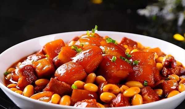 原料:五花肉500克,黄豆300克,生姜5克,黑豆1汤匙,生豆1汤匙,白糖10克,料酒10克,八角3粒,花椒5克,三片香叶,一勺盐