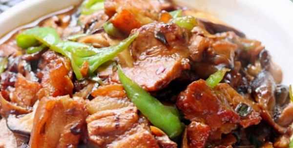 材料:香菇、五花肉、姜末、葱花、蒜末、青椒、料酒、盐、蚝油、糖、黑酱油