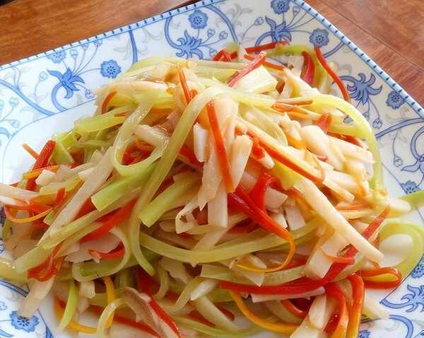 材料:金针菇、黄灯笼椒、大葱、蒜茸、生抽、香醋、香油、蜂蜜(糖)。