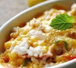 2.鸡蛋罐头去皮,切块,放在豆腐碎上面;
