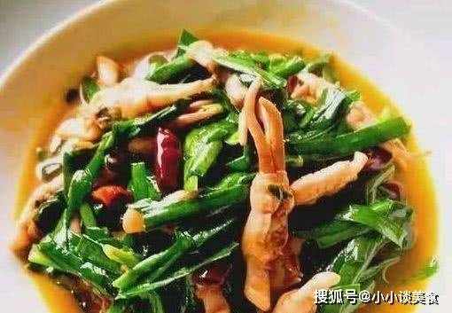 3、接下来,将去皮的刀肉倒入锅中,淋上料酒,开大火翻炒。然后将韭菜倒入锅中,加入食盐、生抽、老抽转大火翻炒,翻炒几下,即可上桌。