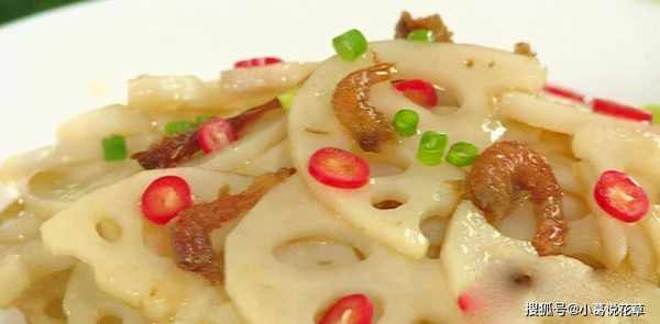 5、锅内放油,放入虾米和蒜头,炒至叶焦,再将肩油淋在藕片上,拌匀入味。