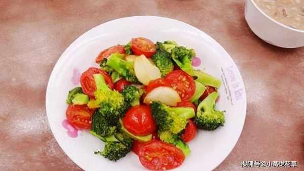 材料:西兰花250克,水果番茄150克,蒜瓣2瓣,油适量,盐适量,生抽适量,白糖适量