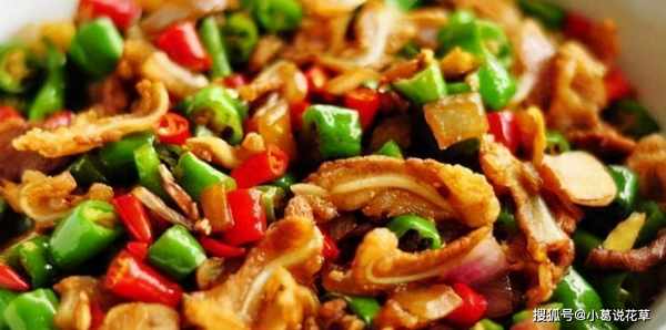 3、烧热油锅,将猪尾放入料酒中翻炒,加入姜片、蒜片、花椒、西洋菜、辣椒炒香,再加入葱、豆角炒熟,加入鸡肉。烹饪中的香精和醋。能。