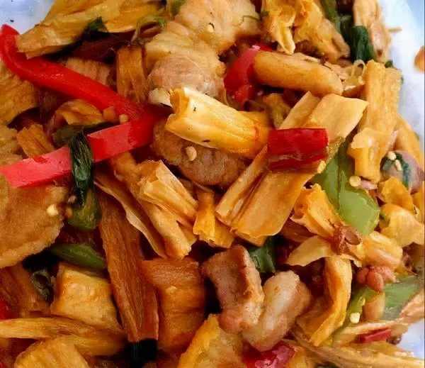 材料:五花肉、腐竹、青椒、姜、蒜、剁椒、食用油、盐、鸡精、胡椒粉适量;