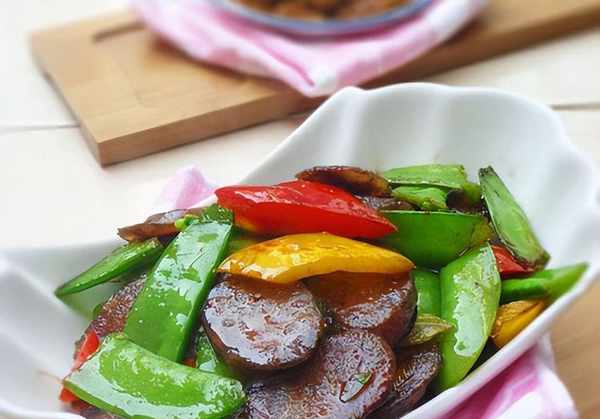 2.锅里倒入油,爆香大蒜和小葱,加入荷兰豆和灯笼椒翻炒一半。