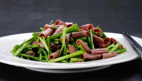 原料:海鲜肠500克,韭菜少许,盐、鸡精适量。