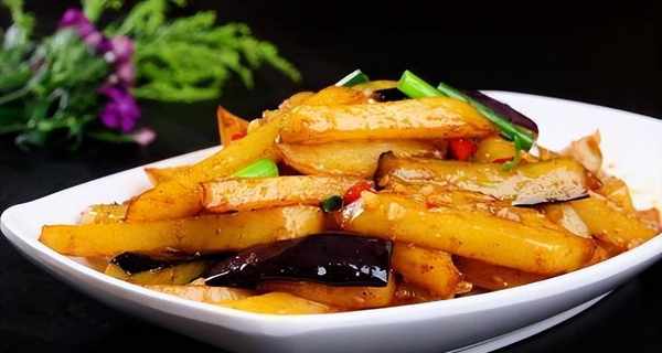 5、油温升至7-8%,加入茄子炒至熟,捞出检油待用。