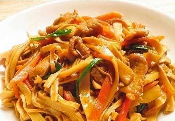 4:将肉丝放回锅中用千张炒一下,淋上一勺酱油炒匀。