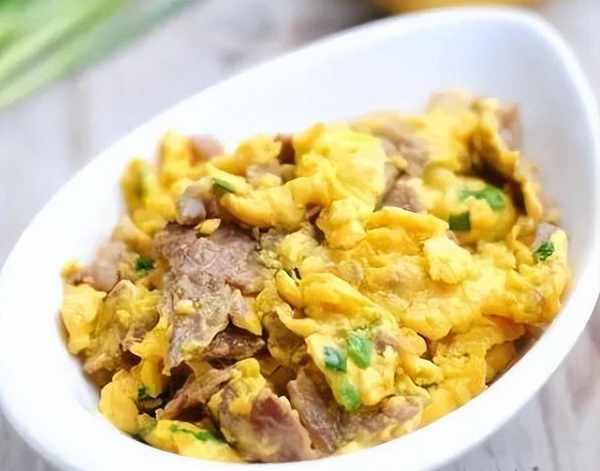 4.锅中倒入植物油,40%热时,加入牛肉片,滑至80%,备用。5、将抹平的牛肉片倒入蛋液中,加入葱花拌匀。