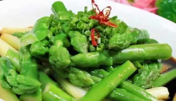 芦笋10根,花生油1汤匙,香油1茶匙,生抽1汤匙,白糖1茶匙,盐1茶匙,蒜2瓣,切碎准备:芦笋洗净,去根,放在沸水中,然后将一茶匙盐倒入沸水中。一分钟后,取出芦笋,放入冷水中浸泡一分钟。取出,切成两半,放在盘子里。在一个小碗里,将酱油、糖和芝麻油混合在一起。锅里放花生油,烧热后(油温不要太高),加入蒜末,炒一秒(不要炒),马上把油倒入小碗里,拌匀倒在芦笋罐头上。
